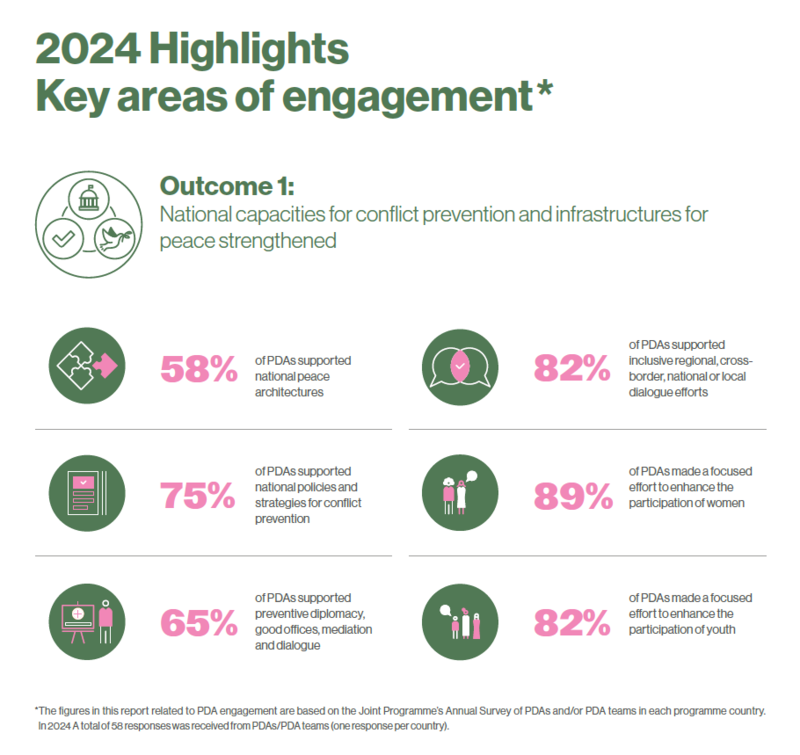 Beyond the deployment of PDAs, the Joint Programme also facilitates deployment of short-term expertise to respond and engage in crisis settings, provides coordinated and complementary UNDP and DPPA support, analysis, and engagement in target countries, and builds on the expert knowledge of its stakeholders to share good practices, lessons learned, and engage in a community of practice. Aiming to serve as a platform that brings together various UN tools and approaches, the Joint UNDP-DPPA Programme contributes to coherent UN engagement by working in partnership with other UN entities, such as the Peacebuilding Support Office (PBSO), UN Volunteers (UNV) and UN Women.